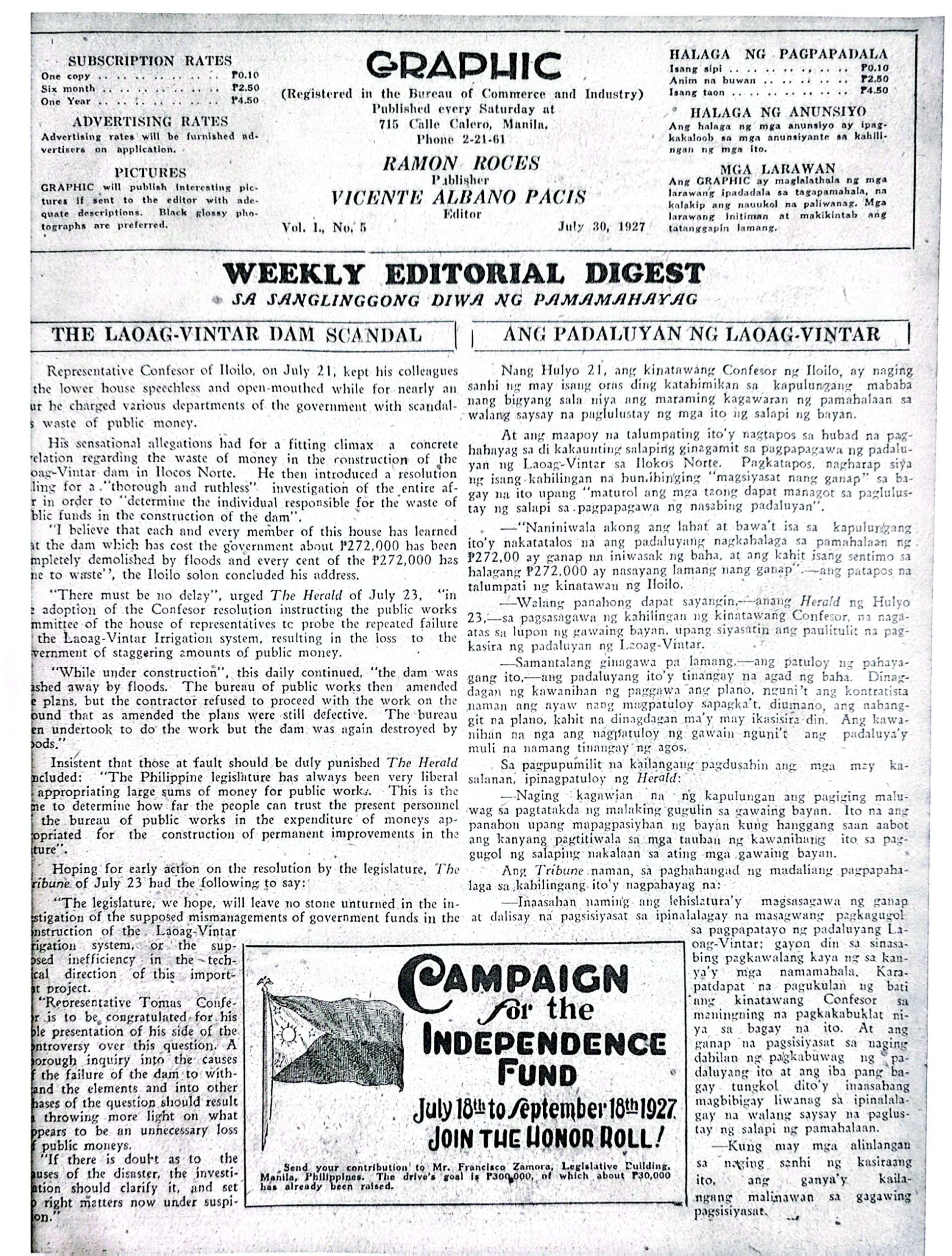 His sensational allegations had for a fitting climax a concrete revelation regarding the waste of money in the construction of the Laoag-Vintar dam in Ilocos Norte. He then introduced a resolution calling for a “thorough and ruthless” investigation of the entire affair in order to “determine the individual responsible for the waste of public funds in the construction of the dam.”