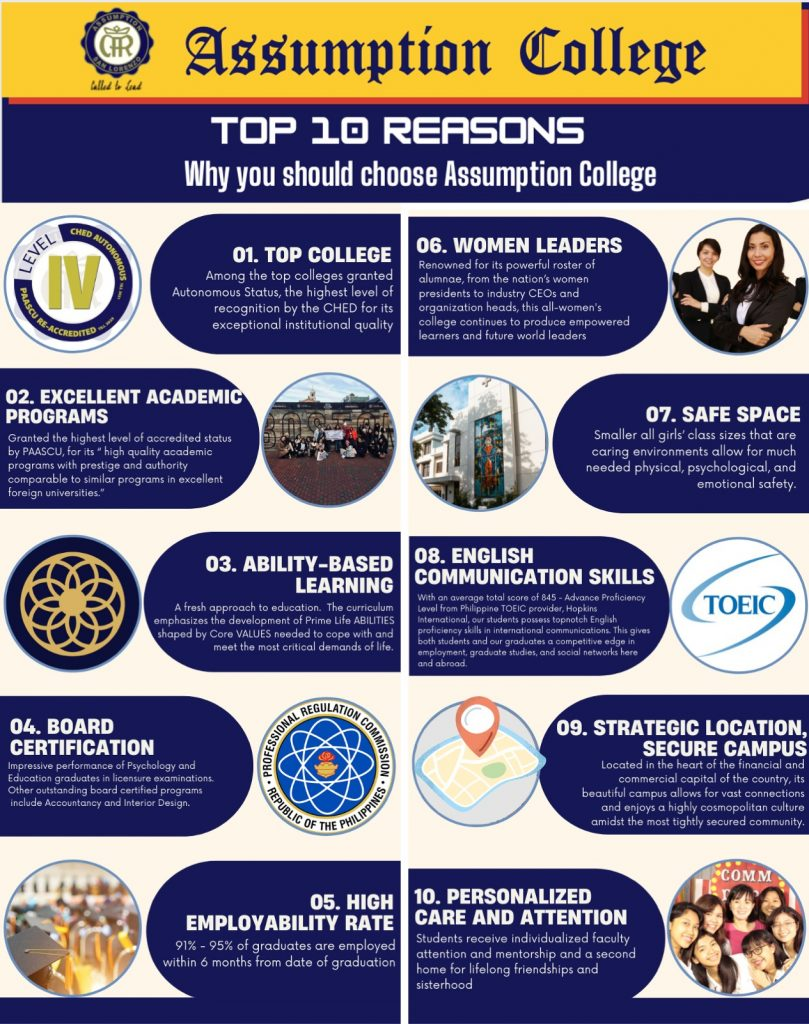 As such, Assumption College students are able to grow independent, confident, and capable of taking on life’s challenges, preparing them to find success in their endeavors both in the local and global scale.