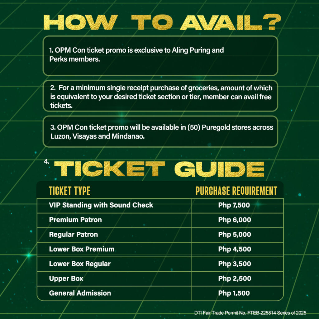 And Puregold is making it easy for all Aling Puring and Perks card members. Here’s how: to receive a free ticket to OPM Con 2025, they must make a minimum single receipt purchase of groceries that corresponds to their ticket type. The ticket types and their purchase requirements are as follows: