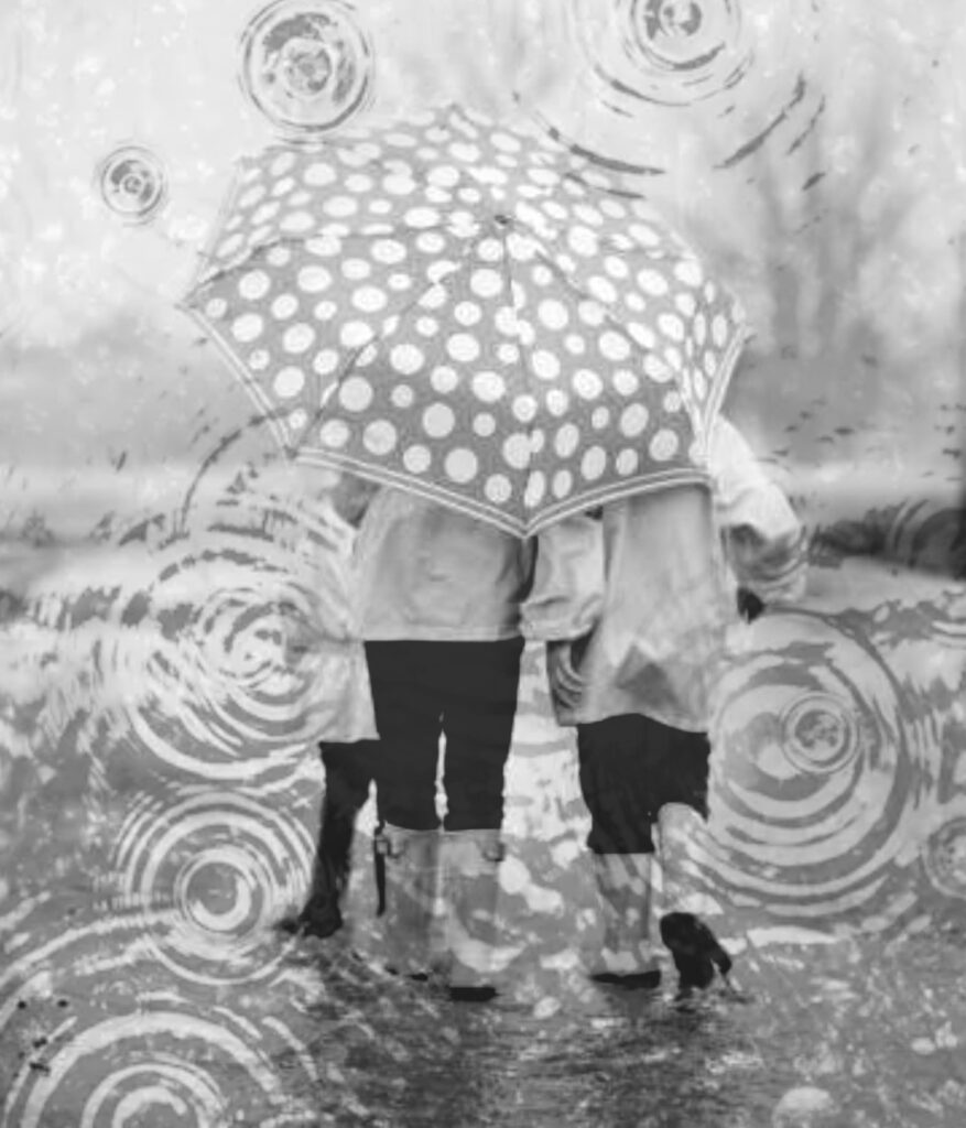 Seeing her sister jump in the puddle, Kiki’s expression turned into a bright one as she wore a smile on her face. She placed the soft drink down and ran to her sister while her giggle turned into laughter. Emma reached for Kiki’s hand and held it as they spun around the puddle with the rain pouring down.