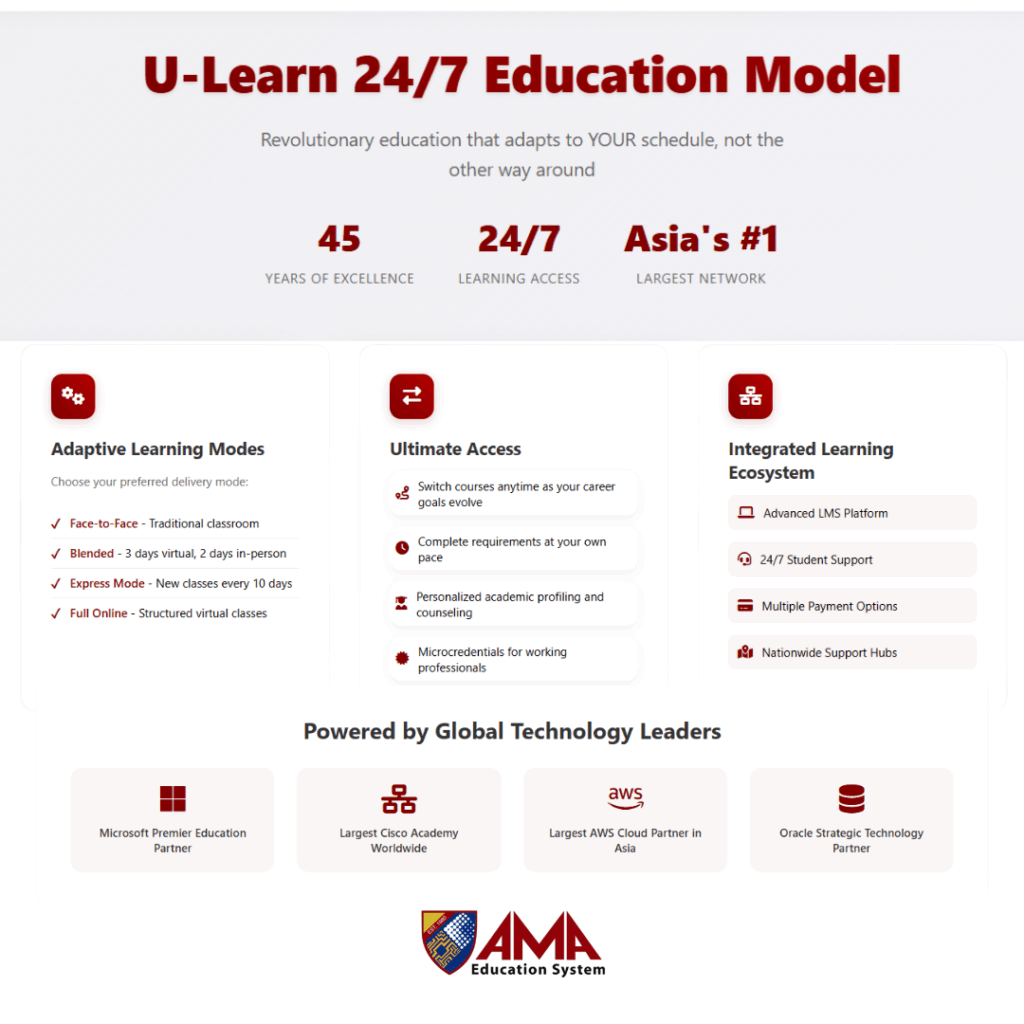 For decades, education in the Philippines has been limited by rigid schedules, geographical barriers, the availability of highly specialized programs, and inflexible learning paths. AMAES breaks through these constraints by empowering learners to choose their preferred mode of delivery whether full face-to-face, blended, fully online with structured schedules, or self-paced learning guided by a virtual mentor. What makes the U-Learn 24/7 Education Model groundbreaking is that while it maximizes choice and accessibility, it never compromises academic integrity, quality, compliance standards, or alignment with international best practice.