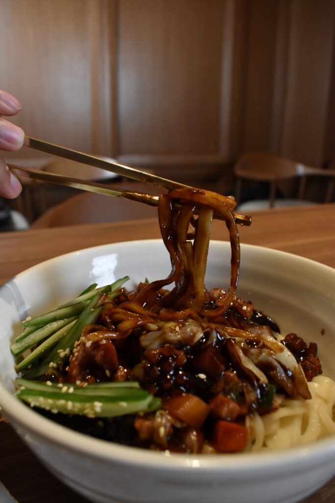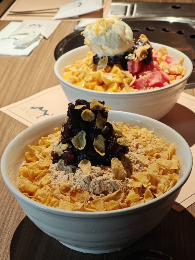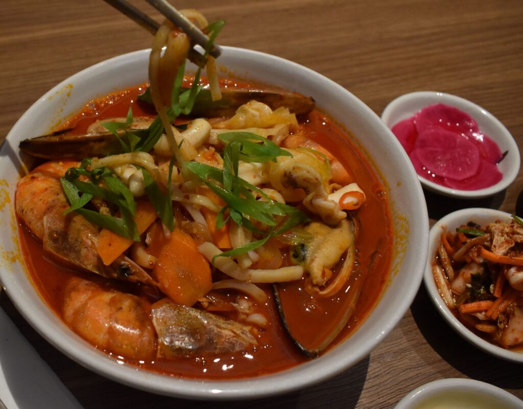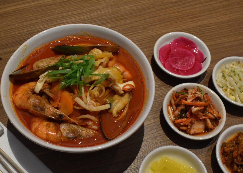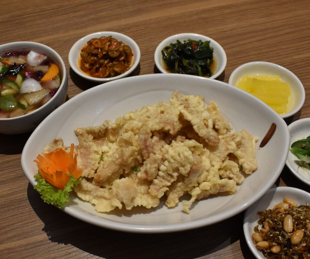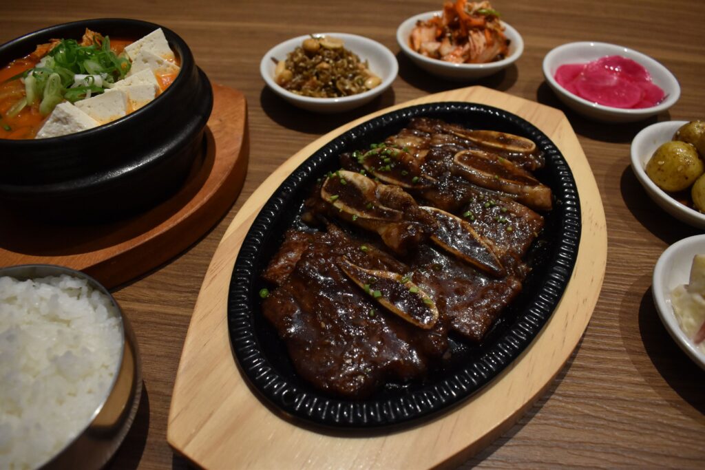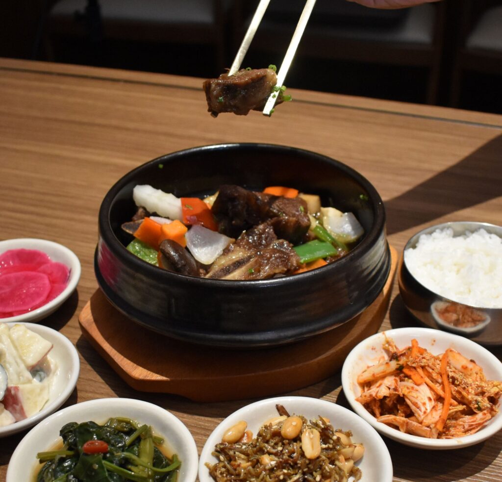 Not-to-be-missed dishes include appetizers such as Chadolbagi (pan-fried beef brisket salad), Modum-jeon (assorted pancakes, skewered fish, pork, and beef), Haemul Kimchi Jeon (kimchi seafood pancake), Japchae (pan-fried vegetables and glass noodles with beef), Saeu-twigim (shrimp tempura), Dakgangjeong (deep-fried chicken with sweet sauce), and Dongchimi (cold radish kimchi); main courses Yangnyeom Galbi (beef short ribs marinated in a special sweet sauce), Dak BBQ (spicy chicken barbecue), and Samgyeopsal (pork belly); hearty soups Galbitang (beef short rib soup with glass noodles and fresh ginseng), Kimchi-jjigae (kimchi stew with pork), and Chadol Doenjang-jjigae (soybean paste stew with beef brisket); and dessert option of Pat Bingsu (shaved ice with sweet red beans and cornflakes), to name a few.