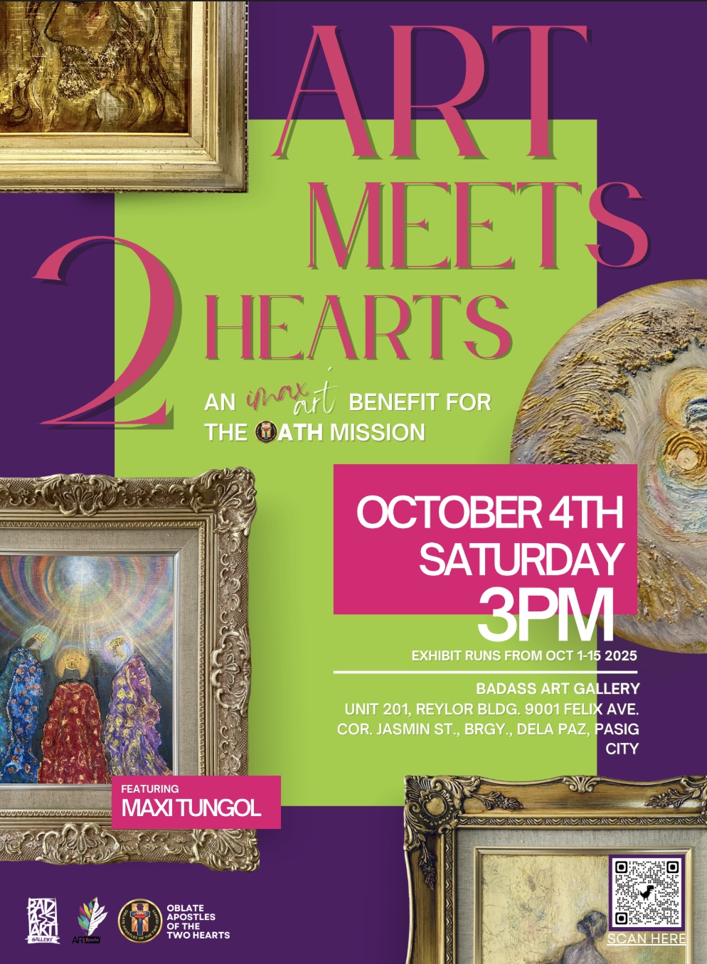 Artist Maxi Tungol, or “Imax” as she signs her works, mounts her first solo art exhibit for a cause: A significant portion of the proceeds will benefit the OATH mission to develop and empower underprivileged youth. The title of the show, “Art Meets 2Hearts,” illustrates the partnership between the artist and the Oblate Apostles of the Two Hearts (OATH) in their joint commitment to elevate art as a medium for change.