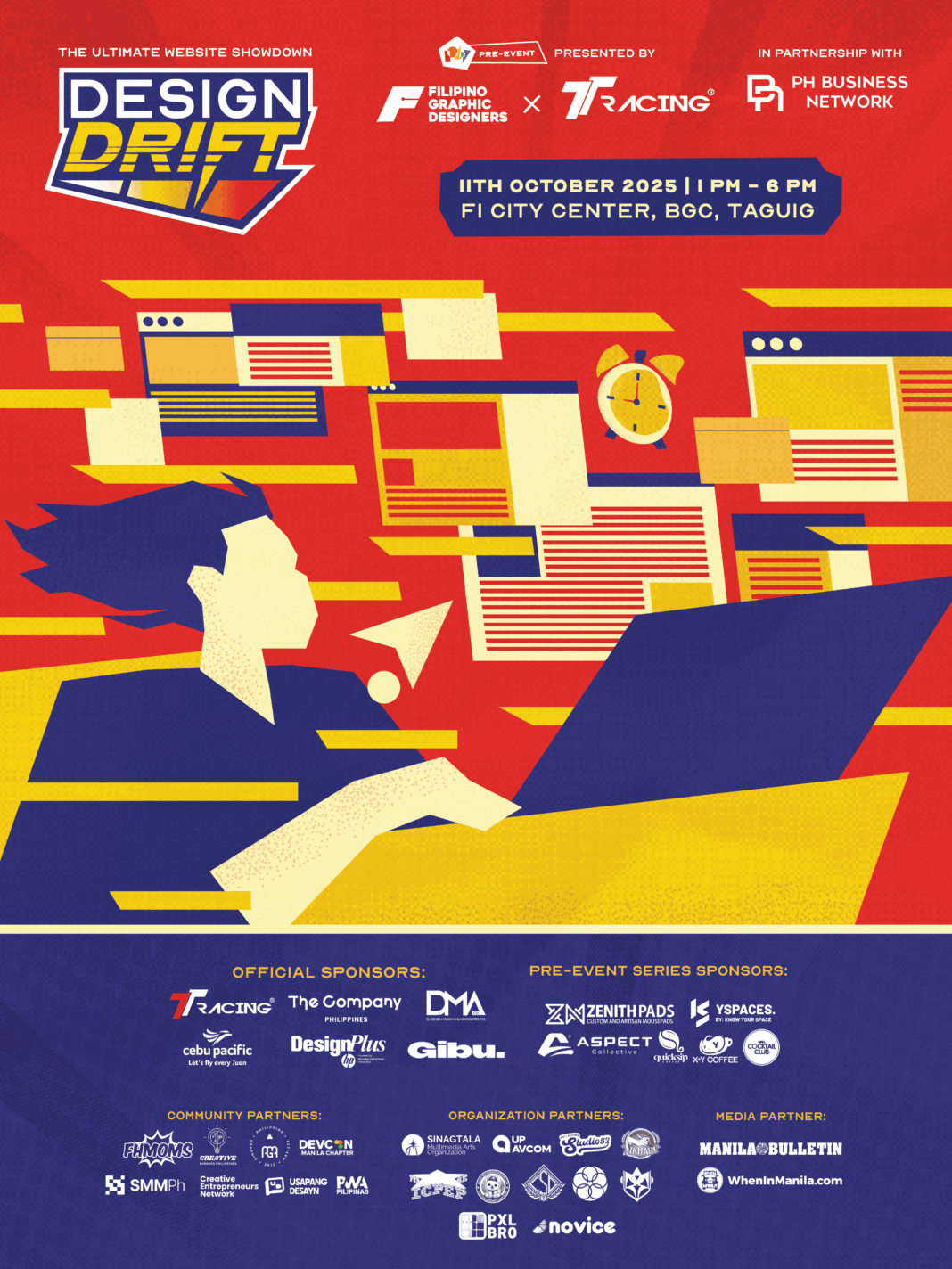 Design Drift is made possible through the support of its official sponsors and partners: TTRacing, DM&A Co., The Company Philippines, HP Indigo / DesignPlus, Gibu Agency, Cebu Pacific, Epson, Asus, Converge, Wacom, ZenithPads, YSpaces, Aspect Collective, and MNL Cocktails Club. Updates and livestream details will be available at facebook.com/filipinographicdesigners. For inquiries, email filipinographicdesigners@gmail.com. Limited slots for the live audience will be accommodated on-site.