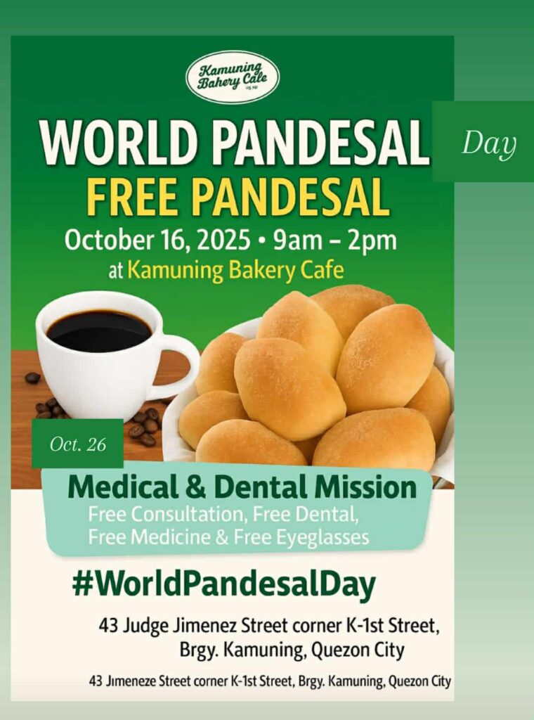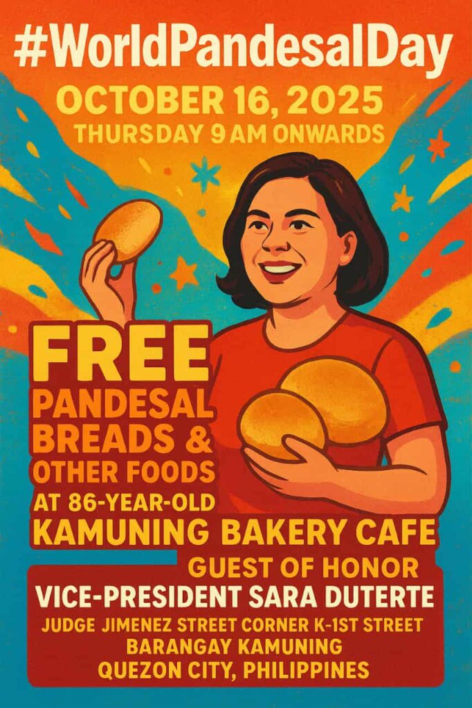 The event will give away 100,000 free pandesal to honor the country’s national bread and to raise awareness about hunger and food security, in line with the United Nations’ “World Food Day.”
