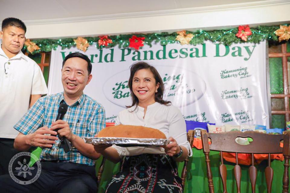 Oct. 16, 2017—Former Vice-President Leni Robredo joined the celebration of World Pandesal Day. Said Robredo: “This occasion is new to me, but a welcome reminder that we should also take delight in the simplest joys in our lives.” Robredo ate pandesal and her childhood favorite Kalihim which she said is called “Maligaya” in her hometown Naga.