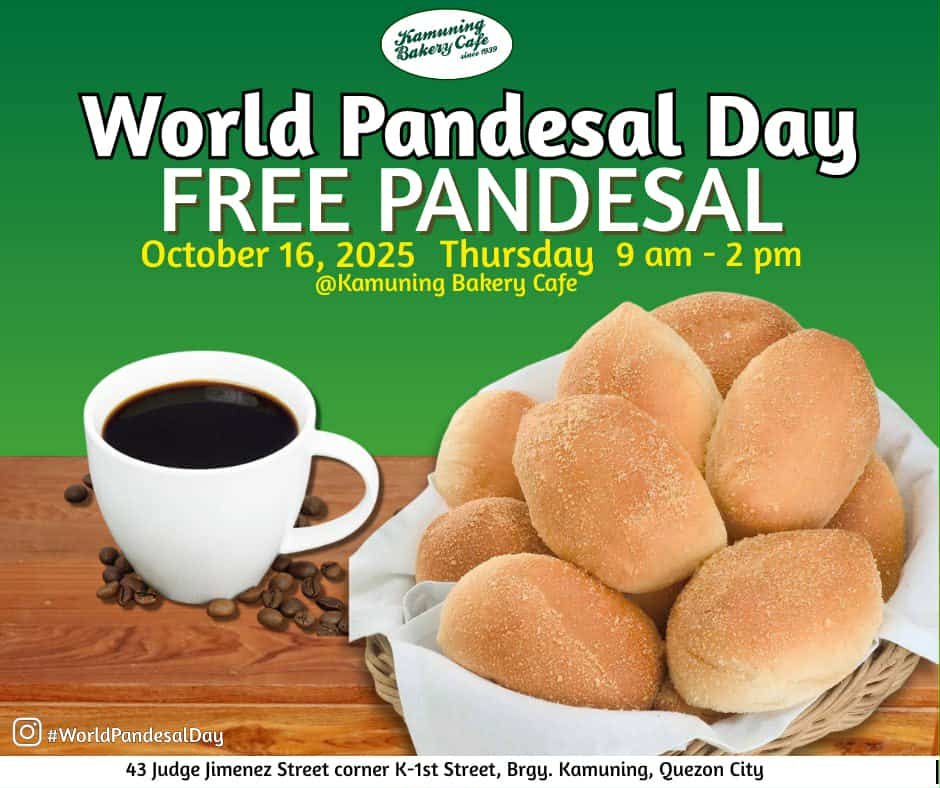 The event will give away 100,000 free pandesal to honor the country’s national bread and to raise awareness about hunger and food security, in line with the United Nations’ “World Food Day.”