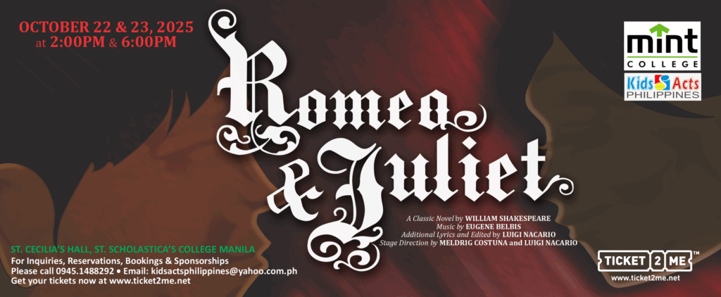 As a season offering to all young adults, Kids Acts Philippines and MINT College collaborate to proudly present ROMEO AND JULIET”, The Musical, edited with additional lyrics by Luigi Nacario, music by Eugene Belbis, and directed on stage by Meldrig Costuna and Luigi Nacario.