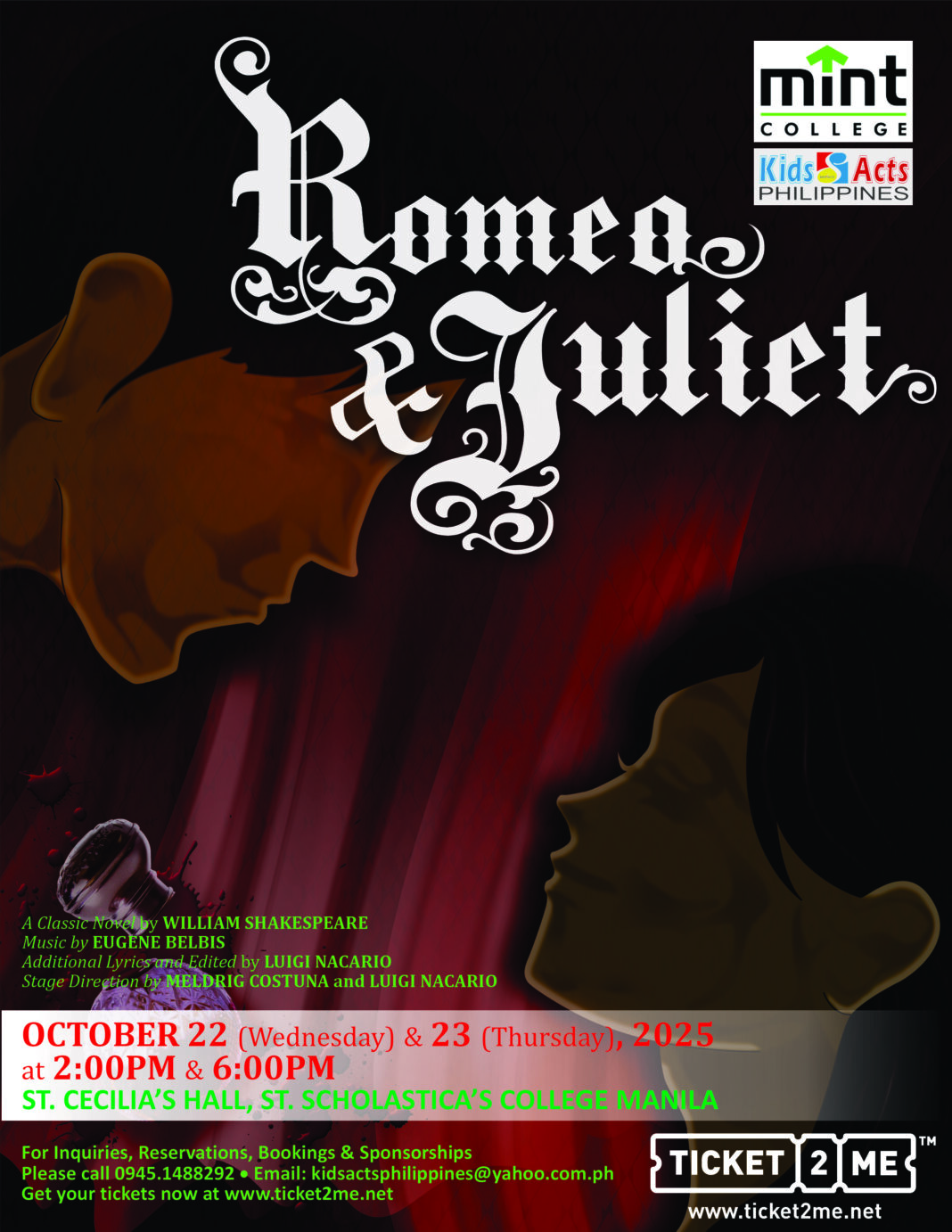 As a season offering to all young adults, Kids Acts Philippines and MINT College collaborate to proudly present ROMEO AND JULIET”, The Musical, edited with additional lyrics by Luigi Nacario, music by Eugene Belbis, and directed on stage by Meldrig Costuna and Luigi Nacario.