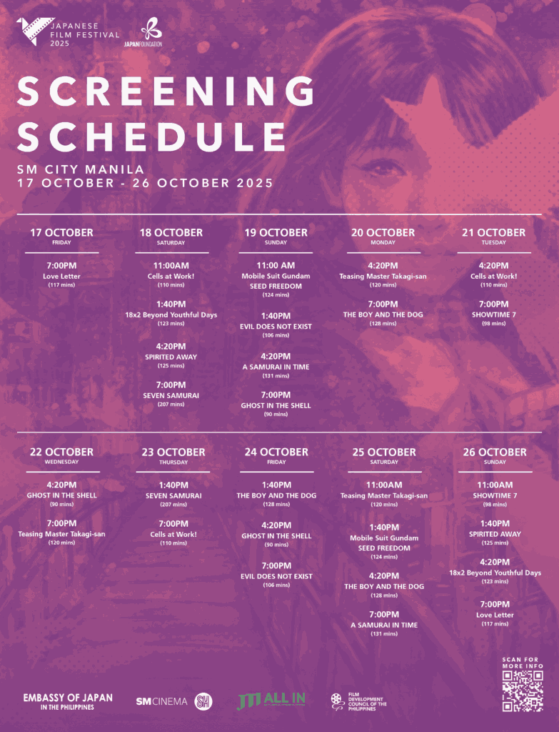 The Japan Foundation, Manila announces the return of the Japanese Film Festival (JFF) to Philippine theaters this October 2025! Don’t miss a specially curated selection of 12 films featuring beloved classics alongside critically acclaimed new releases at SM Cinema Manila ongoing until October 26, 2025. Admission is free for all screenings.