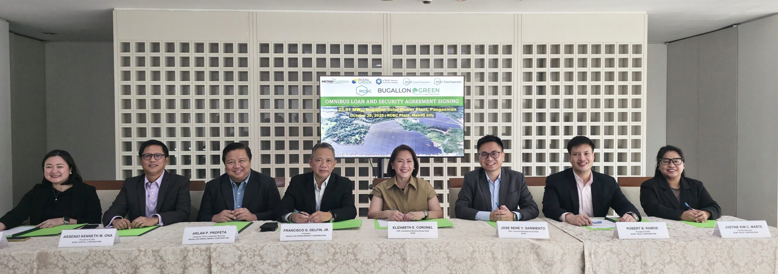 Manila, Philippines, November 3, 2025 – Yuchengco-led Bugallon Green Energy Corporation (BGEC) signed an Omnibus Loan and Security Arrangement (OLSA) for ₱826 million loan facility with Rizal Commercial Banking Corporation (RCBC) for the development of the 25.01 MWdc / 18.56 MWac Bugallon Solar Power Project (BSPP). BGEC is a subsidiary of Rizal Green Energy Corporation (RGEC), a joint venture between PetroGreen Energy Corporation (PGEC) and Japan’s Taisei Corporation.
