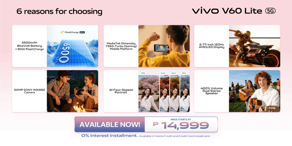 Discover why more Filipinos are making the switch. The vivo V60 Lite series is available in all vivo concept stores, kiosks, and authorized dealers nationwide, and online via the vivo website.