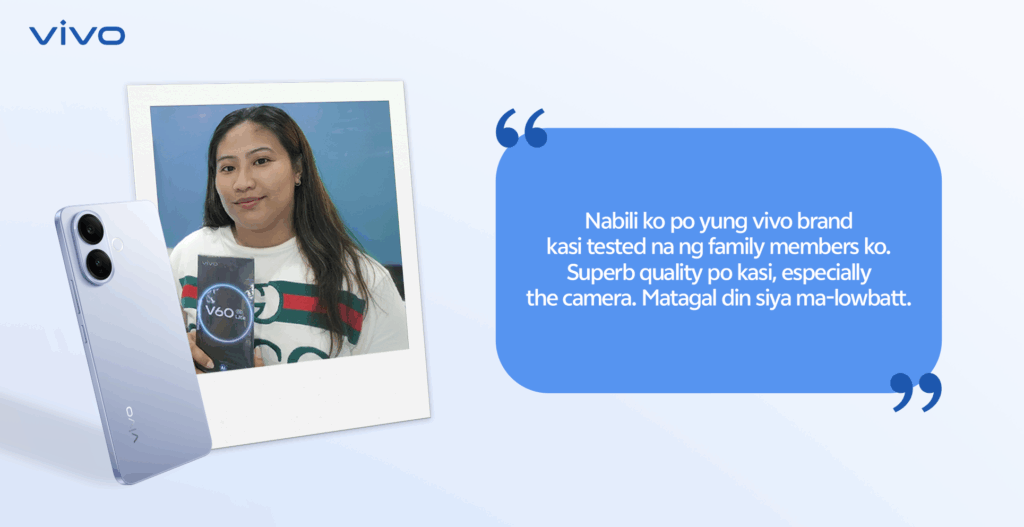 The positive feedback is best captured by customers like Reah Mae Tagumpay, a 30-year-old online seller from Dasmariñas, Cavite, as she shares her experience with her vivo V60 Lite in Titanium Blue.