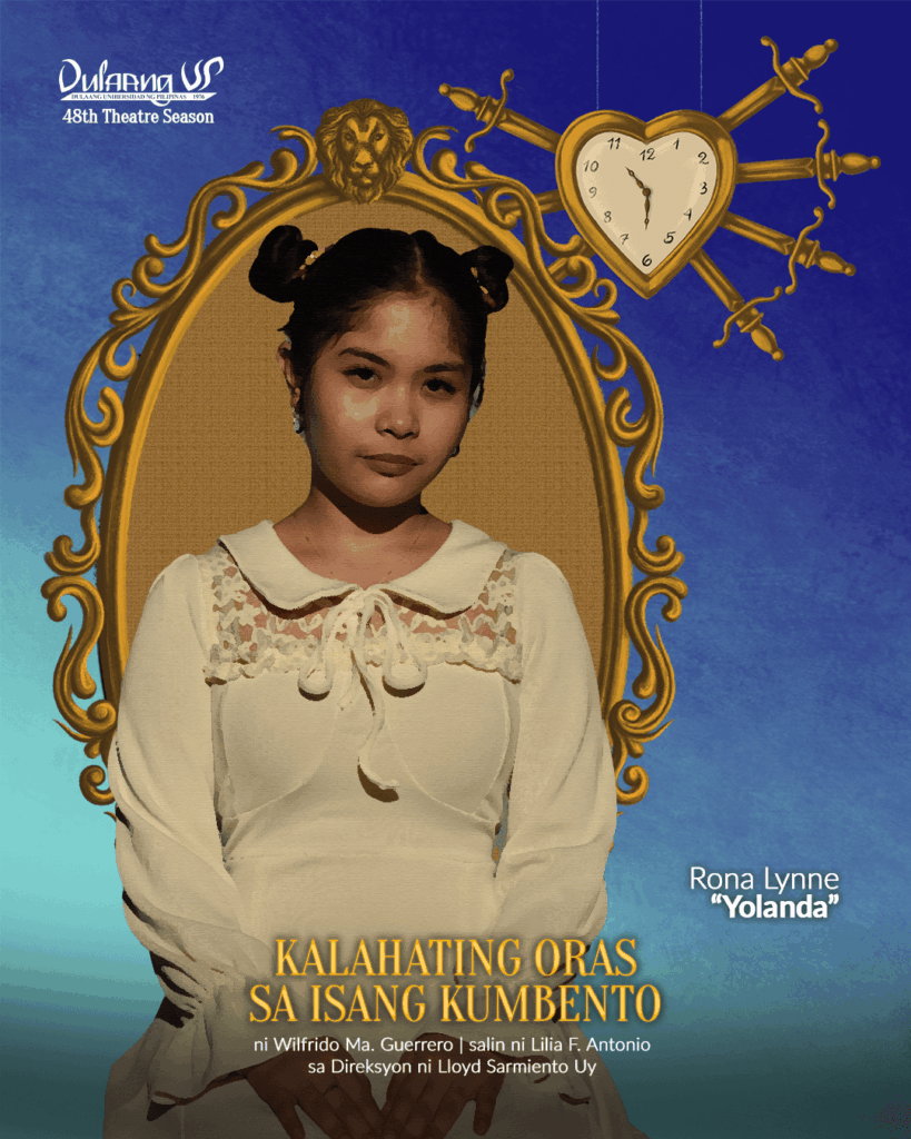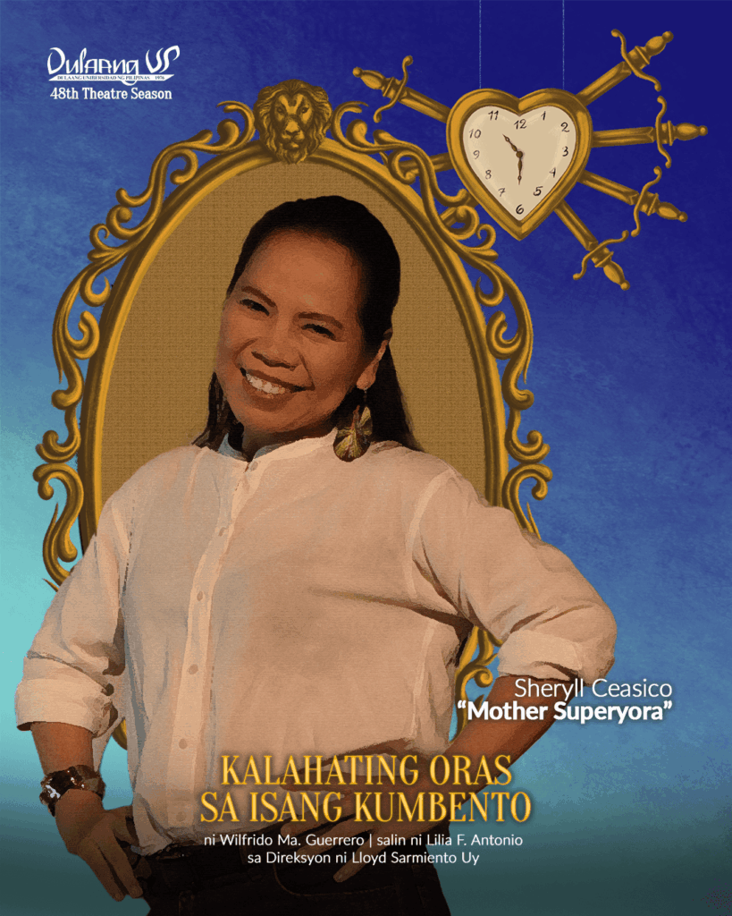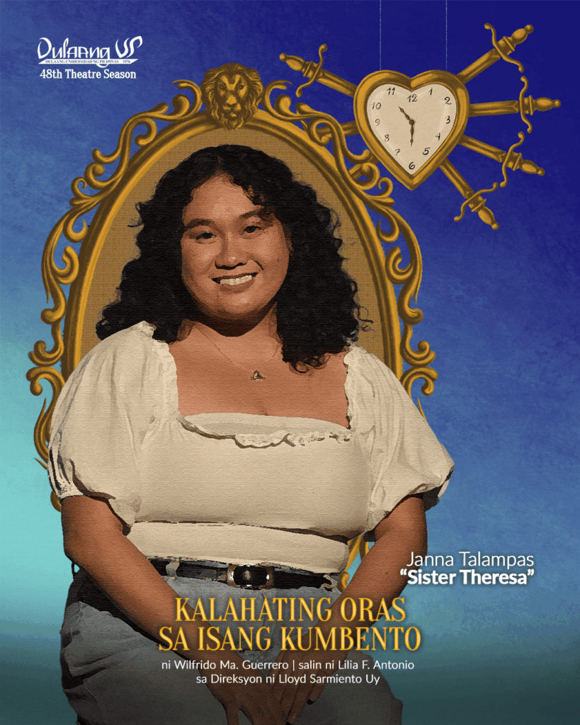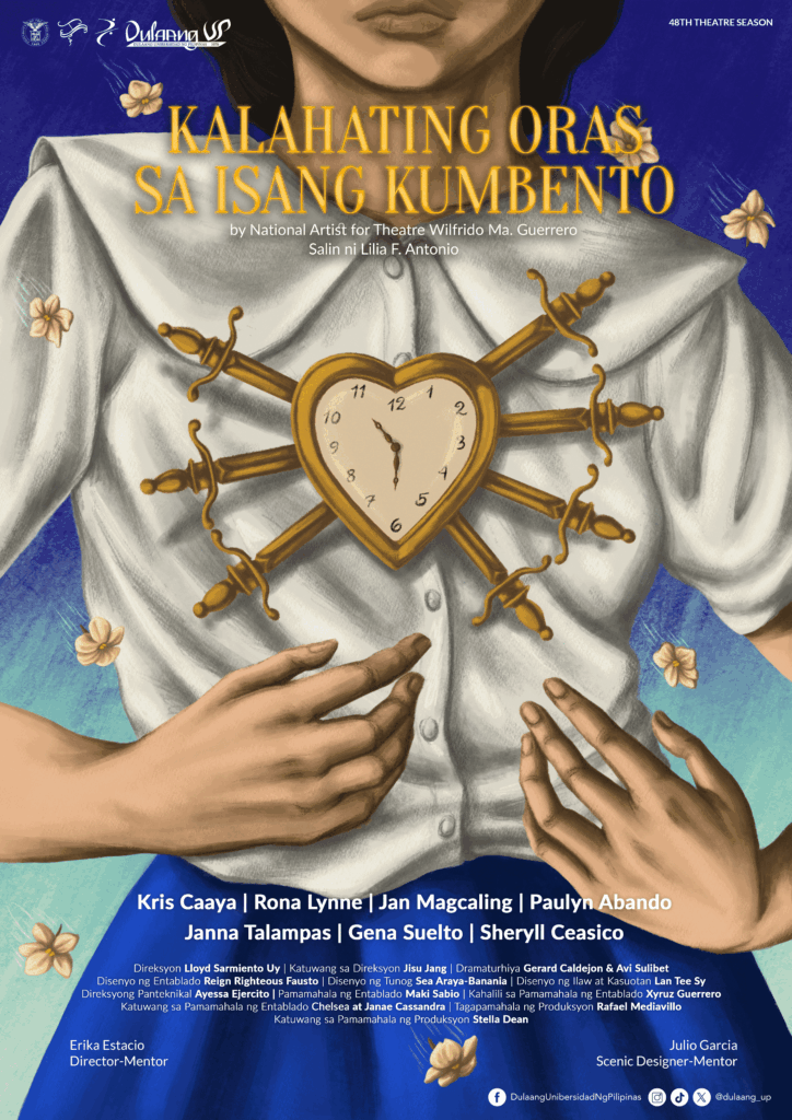 UP Diliman Theatre Arts student Lloyd Sarmiento Uy serves as director, alongside director-mentor Erika Estacio. The cast includes Kris Caaya, Rona Lynne, Jan Magcaling, Paulyn Abando, Janna Talampas, Gena Suelto, and Sheryll Ceasico.