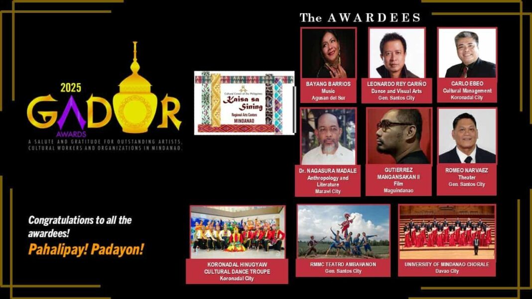 The Cultural Center of the Philippines Kaisa Sa Sining (CCP KSS) Mindanao Network names the roster of artists and culture specialists who will receive the 3rd Gador Award, a recognition for outstanding artists, cultural workers, and organizations in Mindanao. The Awarding Ceremony will take place on December 14, 2025, in Koronadal City, South Cotabato, co-presented by the CCP KSS Mindanao, City of Koronadal, and the Province of South Cotabato.