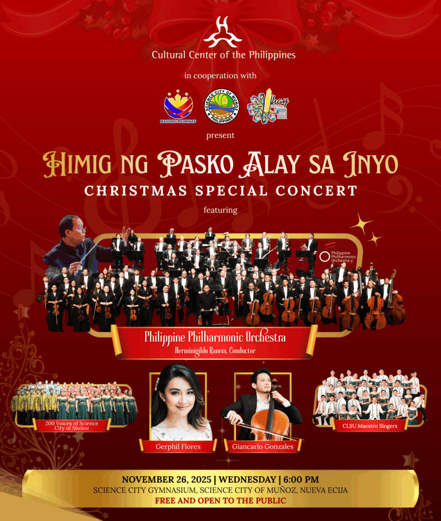 Under the baton of Resident Conductor Maestro Herminigildo Ranera, the orchestra will present a vibrant program, with each concert highlighting a distinct theme. In Nueva Ecija, audiences will be swept into the festive spirit of the Christmas season through the PPO’s lively performances. Dubbed Himig ng Pasok, Alay sa Inyo, the PPO Nueva Ecija concert will feature home-grown performing groups such as the Voices of the City of Muñoz and the CLSU Maestro Singers with opera singer Gerphil Flores and soloist Gian Carlo Gonzales. The concert will begin at 6:00pm on November 26 at the Science City Gymnasium in the Science City of Muñoz.