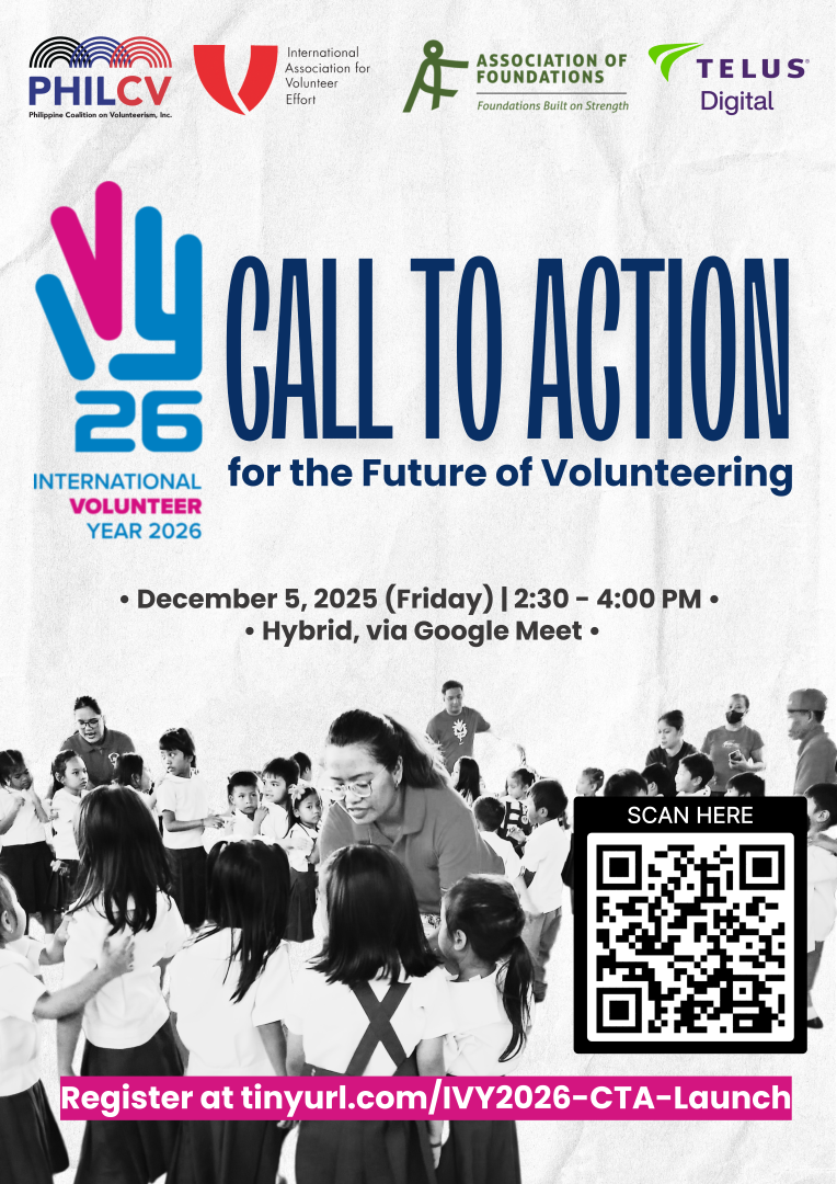 The Philippine Coalition for Volunteerism (PhilCV), with support from the Association of Foundations (AF) and TELUS Digital Philippines, invites volunteers, volunteer groups, and organizations to the Launch of the International Volunteer Year 2026 Call to Action for the Future of Volunteering happening on December 5, 2025 (Friday), 2:30 – 4:00 PM, via Google Meet (hybrid).