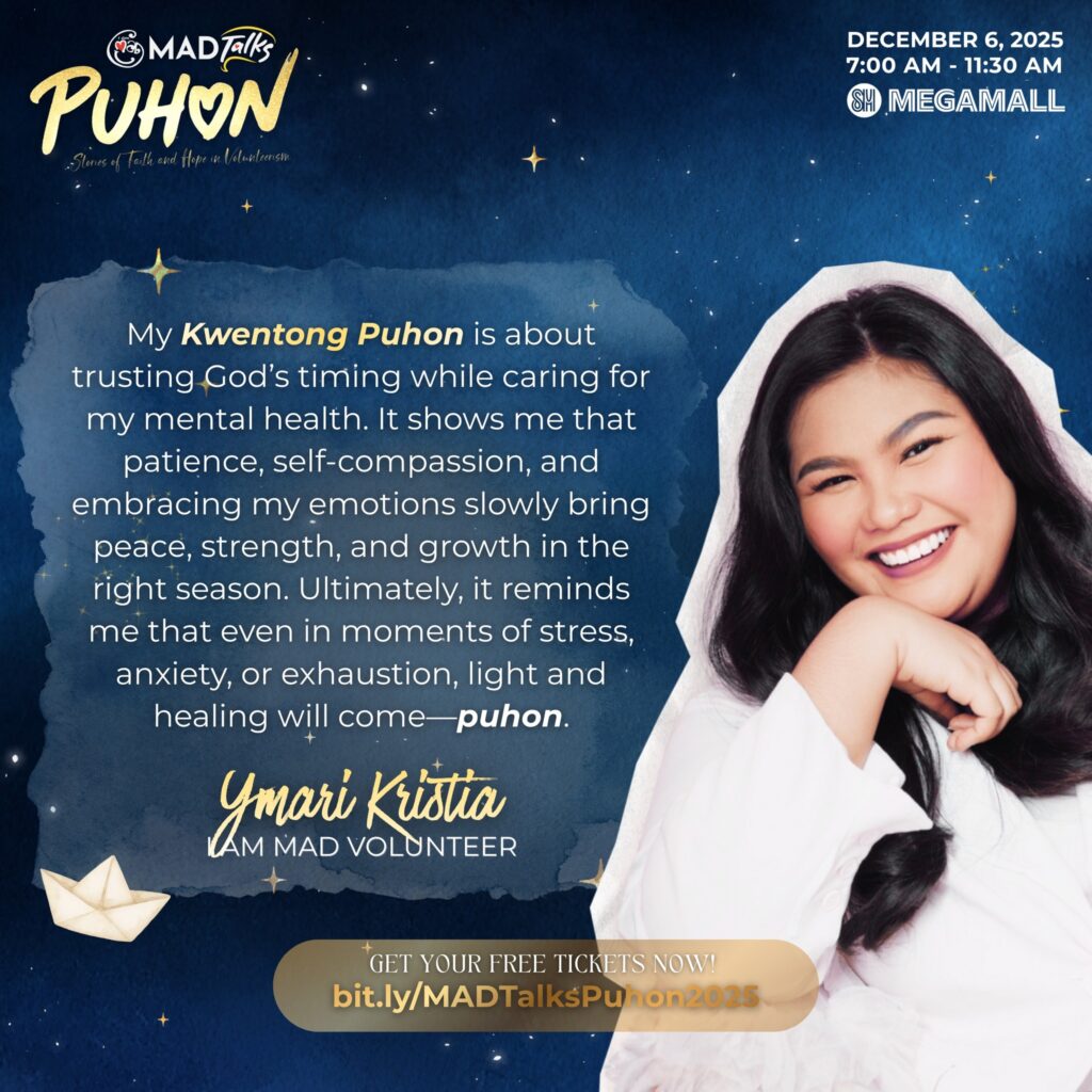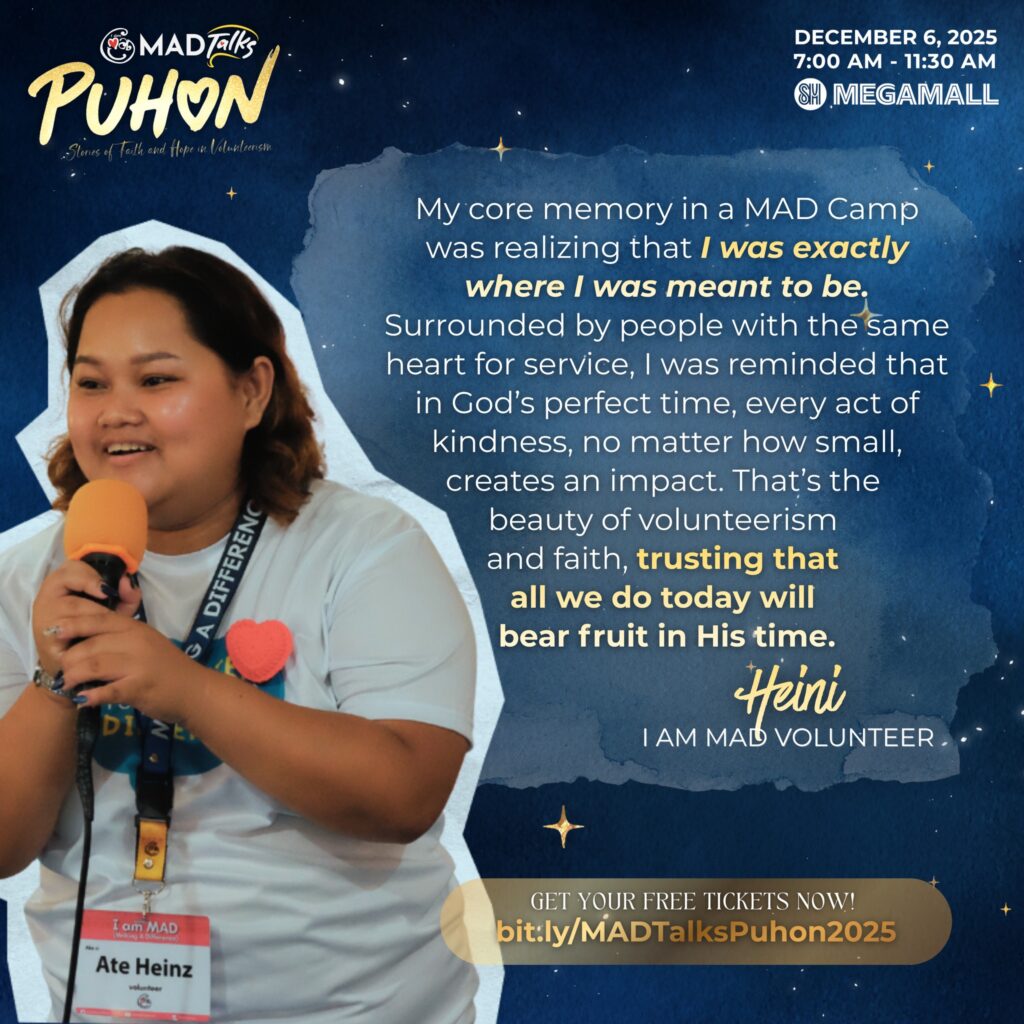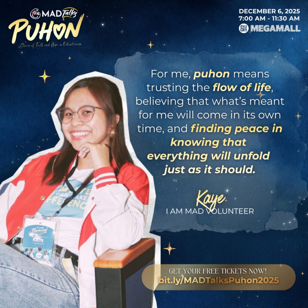 Admission to MAD Talks Puhon is completely free. I am MAD invites volunteers, dreamers, and everyday heroes to hayaán, to let things be and allow what is meant to unfold, and to embrace the sacred rhythm of service, faith, and timing. Registration is now open at bit.ly/MADTalksPuhon2025.