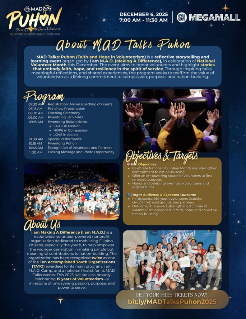 Marking its 15th year, I am MAD will hold MAD Talks Puhon: Faith & Hope in Volunteerism on December 6, 2025 at SM Megamall Cinema 3, made possible through the support of SM Cares, the corporate social responsibility arm of SM Supermalls.