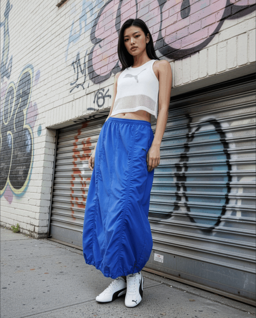 Drop 2 continues the Prime Squared narrative of blending classic designs with modern functionality. The Future Puma Archive line spotlights mesh textures, layered surfaces, and sleek tailoring that echo downtown energy. Highlights include the Mesh Crop Top (PHP 3,200) in Puma White or Mountain Blue and the Straight Patch Pocket Skirt (PHP 3,200) designed with structured edges and clean lines.