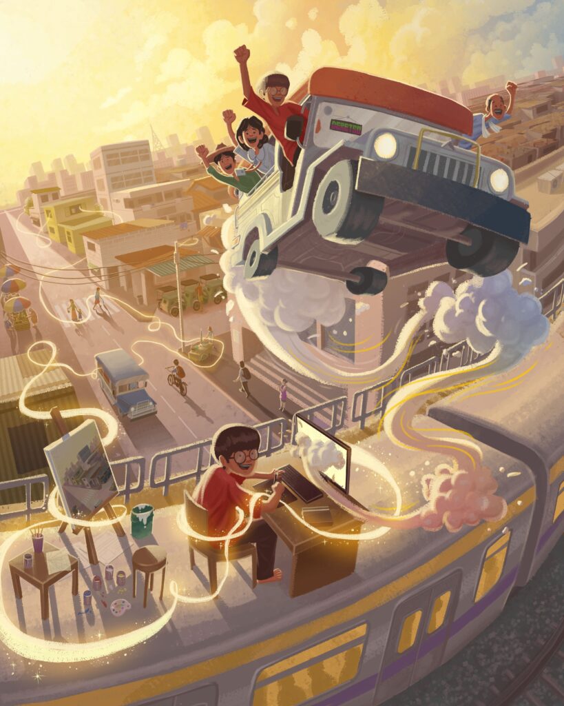 The third-place winner is “Moving Stories” by Amos Ulang of the University of the Philippines – Diliman. The artwork draws from everyday commutes, capturing the nostalgia, shared culture, and simple moments that inspire his creative journey.