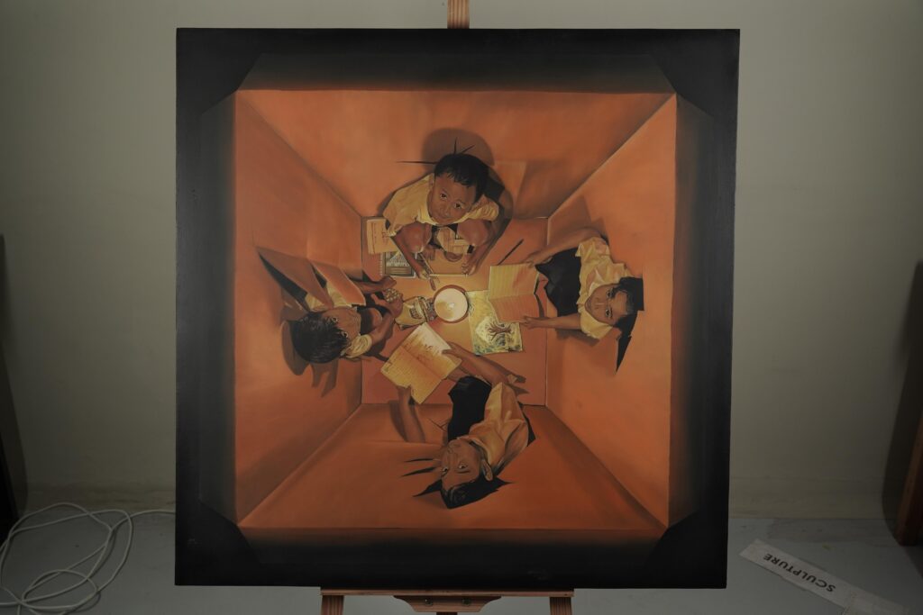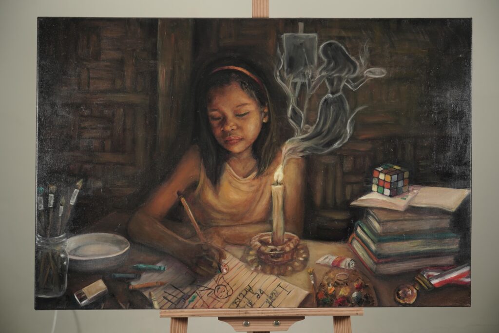 The first-place winner in the Oil/Acrylic category is “Usok na Nagiging Buhay” by Ruth Cenas of the University of the Philippines – Mindanao. The painting shows a young dreamer sketching by candlelight, where rising smoke forms the image of a painter, symbolizing the future she hopes to build.