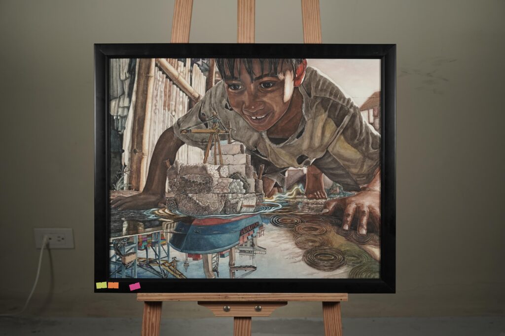 The first-place winner in the Watercolor category is “Odyssey of the Scrap Mariner” by Jonnas Almazar of Bataan Peninsula State University. The artwork shows how a child’s simple scrap-made toy boat becomes a grand vessel through imagination.