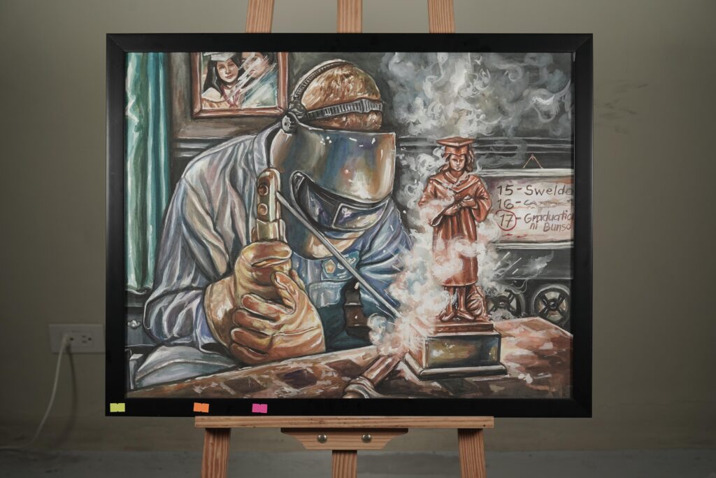 The third-place winner is “Kinsesas” by Keth Byonnsey Estilo of Eulogio “Amang” Rodriguez Institute of Science and Technology. The painting highlights a father who works as a welder, with the sparks representing his love and dreams for his daughters’ future.