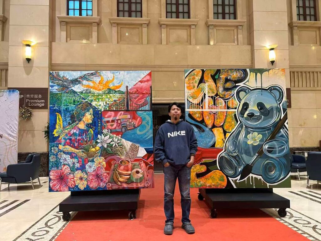 To celebrate the richness of the Philippines, Pollero included the iconic jeepney, a symbol of Filipinos’ resourcefulness and aspiration for industrialization. At the same time, the Chinese artists contributed their own symbols reflecting their culture. “We connected the two panels by painting a bridge and a handshake in the middle of the composition, representing cooperation and the bridging of gaps,” explained Pollero.