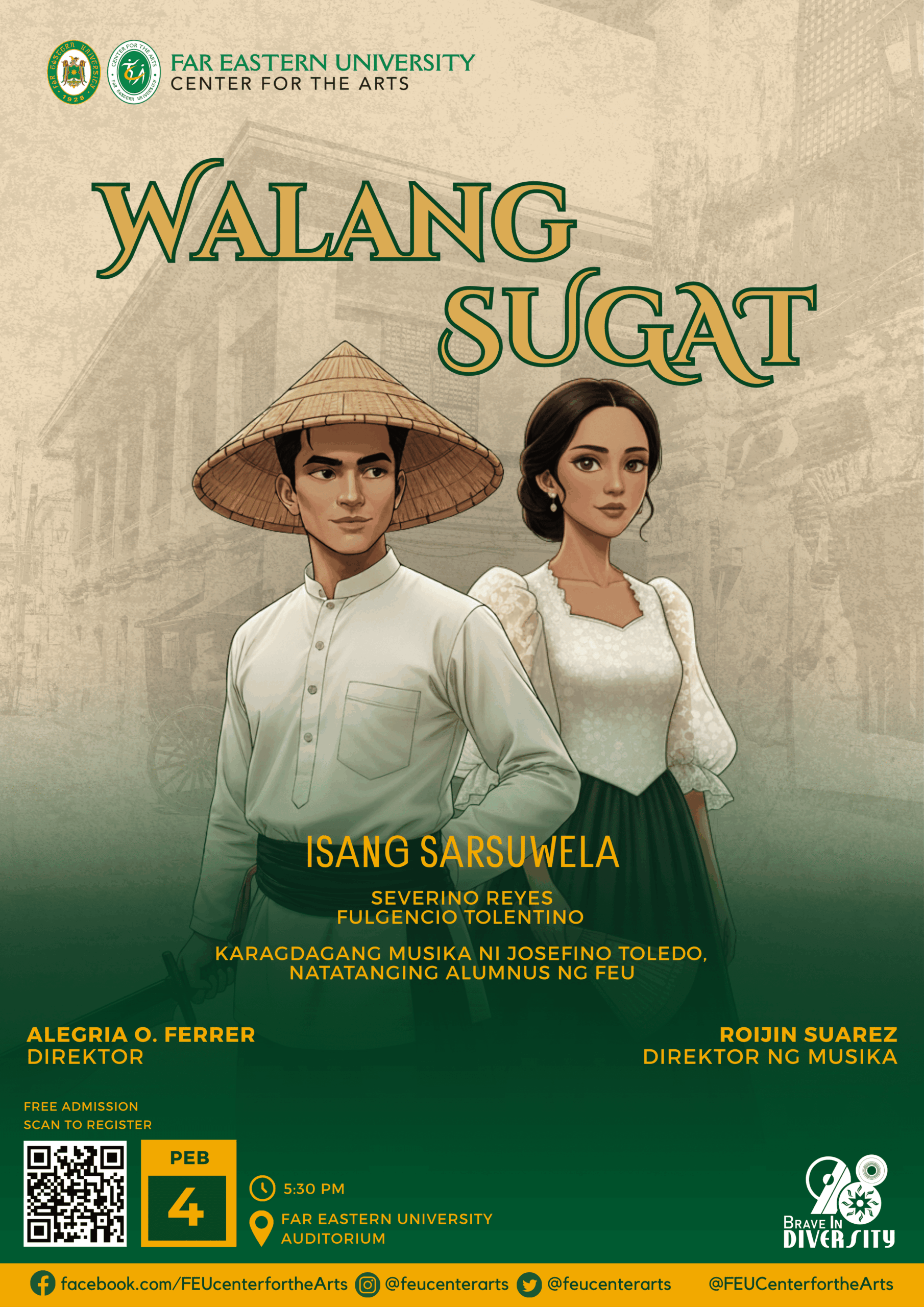 In celebration of Far Eastern University’s 98th founding anniversary, the FEU Center for the Arts (FCA) will stage a performance of Walang Sugat, a historic and more than century old sarswela written by Severino Reyes with music by Fulgencio Tolentino.
