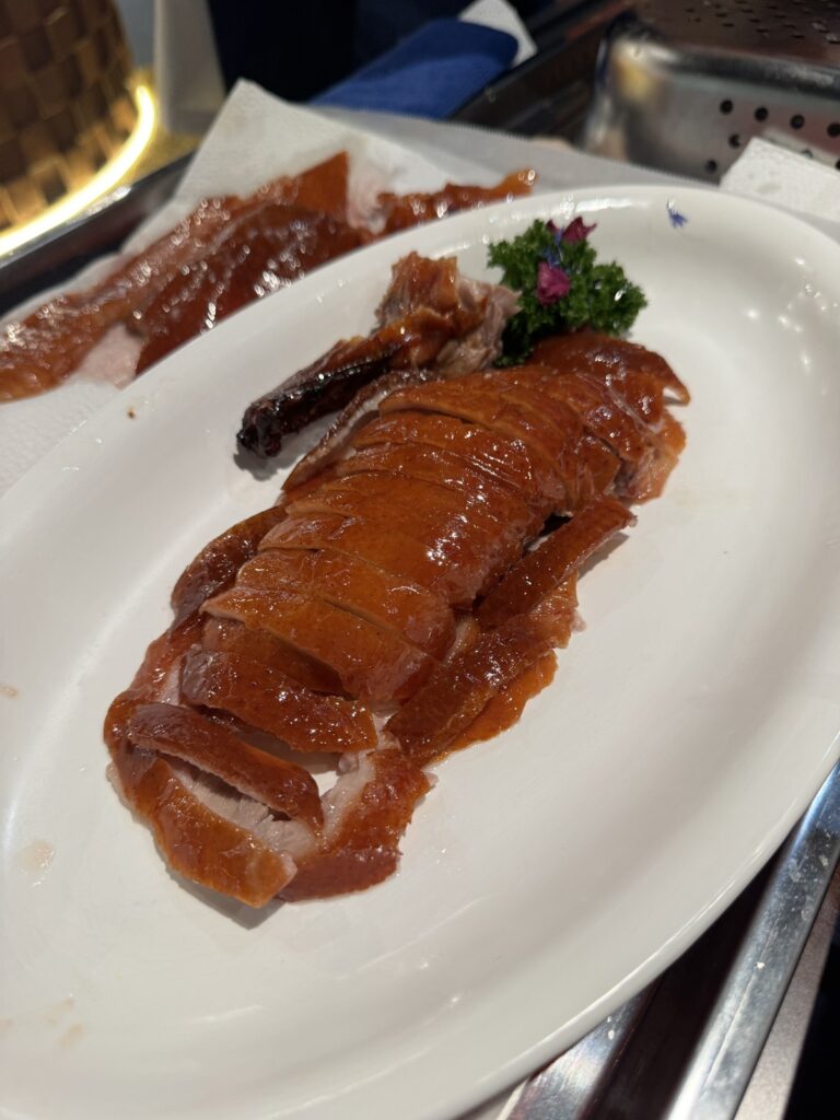 The sliced Peking Duck is the first way; served with the thin Mandarin pancakes, and sidings of cucumber and spring onion, that we are familiar with. There’s the sweet bean or Hoisin sauce, or the pinch of sugar, if eating the skin on its own.