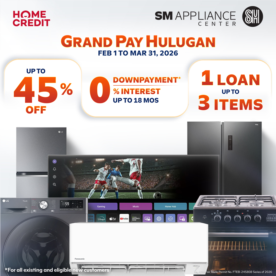 Visit your nearest SM Appliance Center store, SM Appliance Center Website (https://www.smappliance.com/blogs/2026/grand-pay-hulugan1), or SM Appliance Center Facebook page (https://www.facebook.com/SMAppliance) to explore the full list of offers. Promo runs from February 1 to March 31, 2026 and is exclusive to Home Credit customers. Terms and conditions apply.