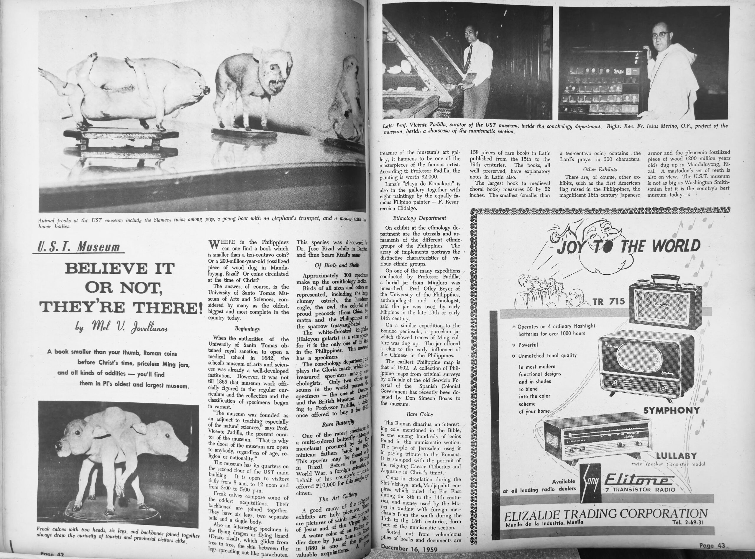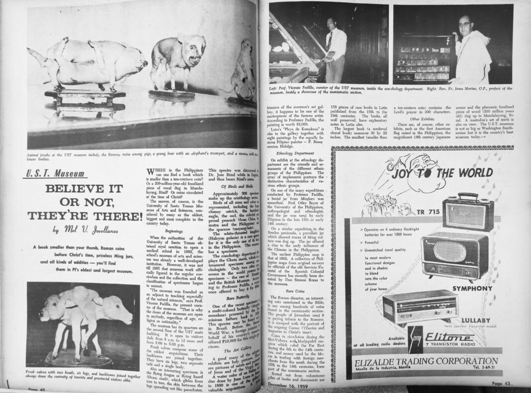 There are, of course, other exhibits, such as the first American flag raised in the Philippines, the magnificent 16th century Japanese armor and the pleocenic fossilized piece of wood (200 million years old) dug up in Mandaluyong, Rizal. A mastodon’s set of teeth is also on view. The U.S.T. museum is not as big as Washington Smithsonian but it is the country’s best museum today. — Mel V. Jovellanos (December 16, 1959)