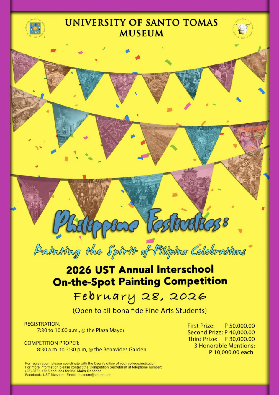 Registration will take place from 7:30 to 10:00 a.m. and the competition will run from 8:30 a.m. to 3:30 p.m. This will be followed by awarding ceremonies, and the exhibit opening will be held at 6:00 p.m. at the UST Plaza Mayor. The winning works will be on exhibit at the UST Museum until March 27, 2026.