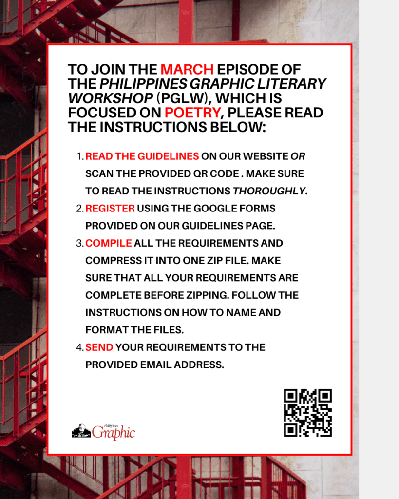 | QUICK FACTS: – Philippines Graphic Literary Workshop is a series of writing workshops. The upcoming episode is focused on POETRY. – The event will be held at the Luxent Hotel along Timog Avenue in Quezon City from March 20 and 21 (Friday to Saturday),10 a.m. to 4 p.m. – The workshop will be facilitated by award-winning performance poet and interdisciplinary artist Nerisa del Carmen Guevara. – This SECOND episode is STRICTLY FOR COLLEGE UNDERGRADUATES. No age limit, but will require a signed and duly noted parental consent for anyone below 18 years old. – Accomplish the registration form here. Then compile all requirements into one (1) zip file and send via email to submit.pglw@gmail.com. – ONLY 30 PARTICIPANTS WILL BE ACCEPTED PER PGLW EPISODE. Qualified applicants will be notified by email. – DEADLINE OF SUBMISSION OF MATERIALS: March 9, 2026 (11:59 p.m). There will be NO EXTENSION. |