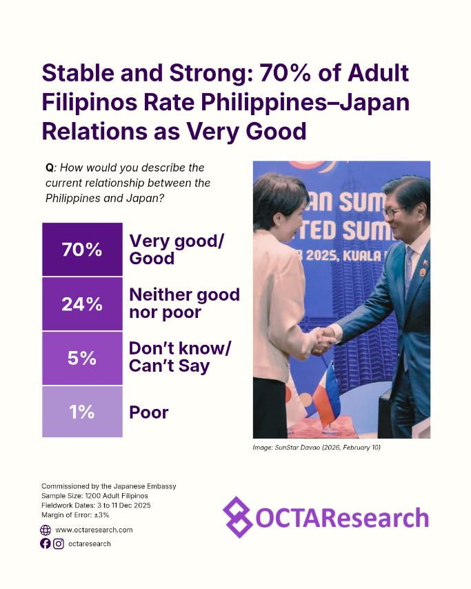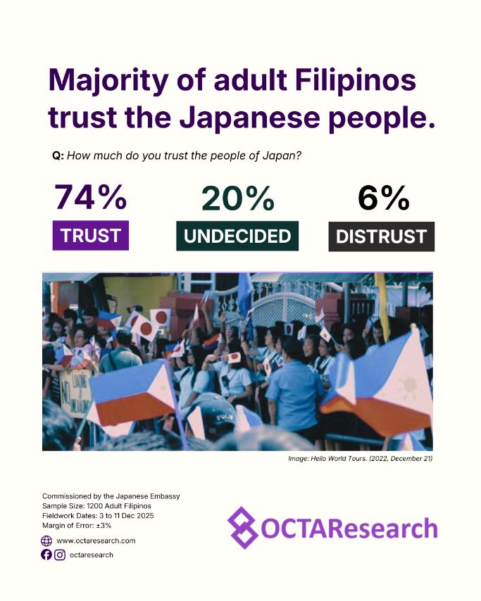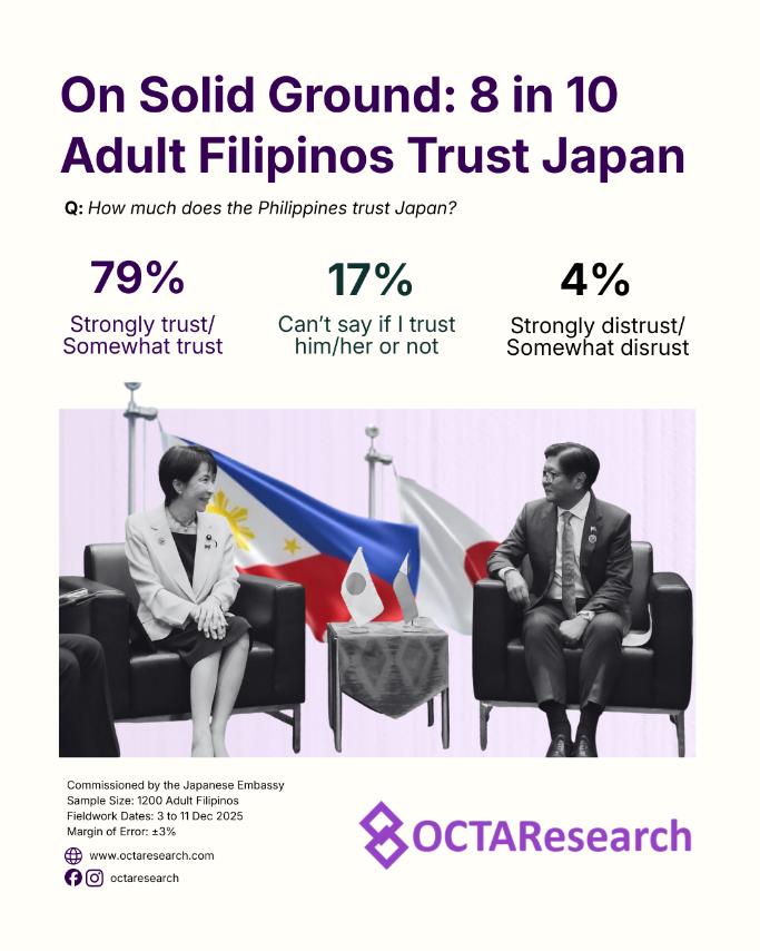 via GRAPHIC PLUS — The OCTA Research Tugon ng Masa (TNM) Q4 2025 nationwide survey indicates that Japan enjoys exceptionally strong public trust among Filipinos. At the national level, 79% of Filipinos trust in Japan, while only 4% express distrust.