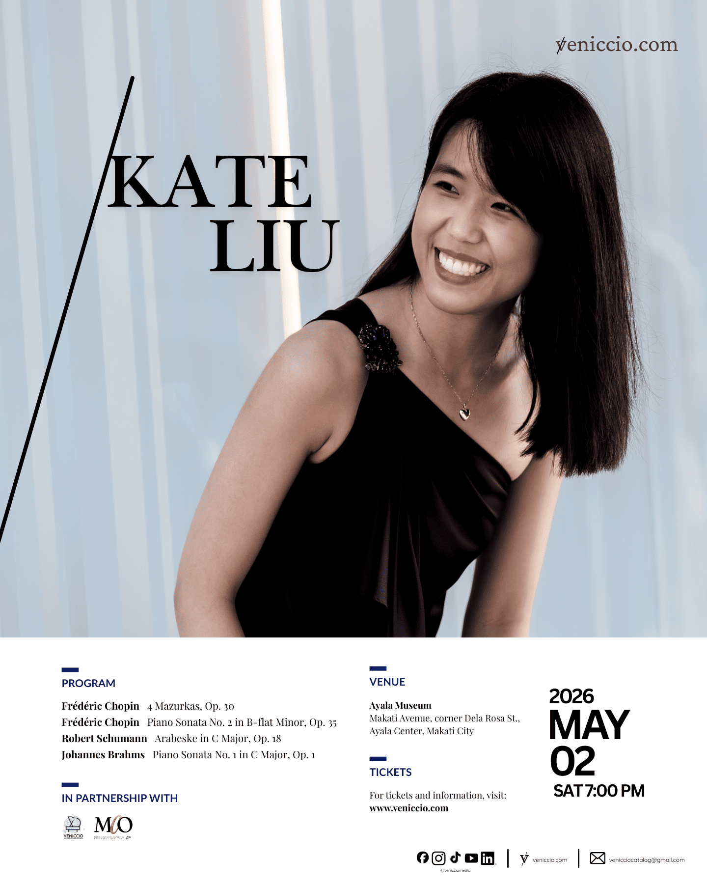 Veniccio.com, in partnership with MA Piano Academy, announces “Kate Liu in Recital,” featuring world-class pianist Kate Liu. The concert marks Liu’s Philippine debut, which will premiere on May 2, 2026, at the Ayala Museum in Makati City. She will perform the piano works of Chopin, Schumann, and Brahms.