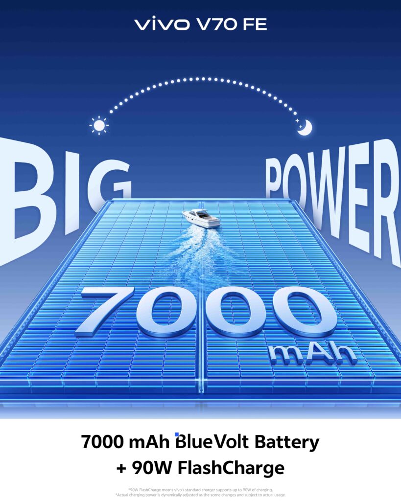 Power meets endurance with the 7000mAh BlueVolt Battery, the most powerful in the V series yet. Whether you’re shooting, streaming, or scrolling, the vivo V70 FE keeps up without missing a beat. When you do need a boost, 90W FlashCharge gets you back in action in minutes, not hours.