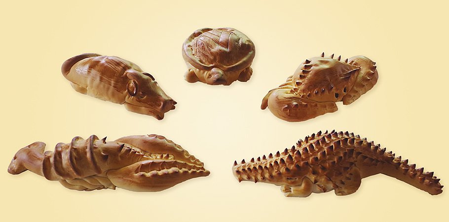 Breads also serve as an ideal medium for creative food art. In Silay, Negros Occidental, empanadas are meticulously fluted in a milles feuilles style, while in Vigan, Ilocos Sur, panaras are crafted with pinched edges and distinctive patterns. The shaping of tortas reales and castillos, sweets influenced by Spanish heritage, continues alongside more modern cake decorations inspired by American traditions. In Antipolo, Rizal, one bakery is popular for making bread into playful shapes, including lobsters, pigs, turtles, and crocodiles, showcasing a unique form of food artistry.